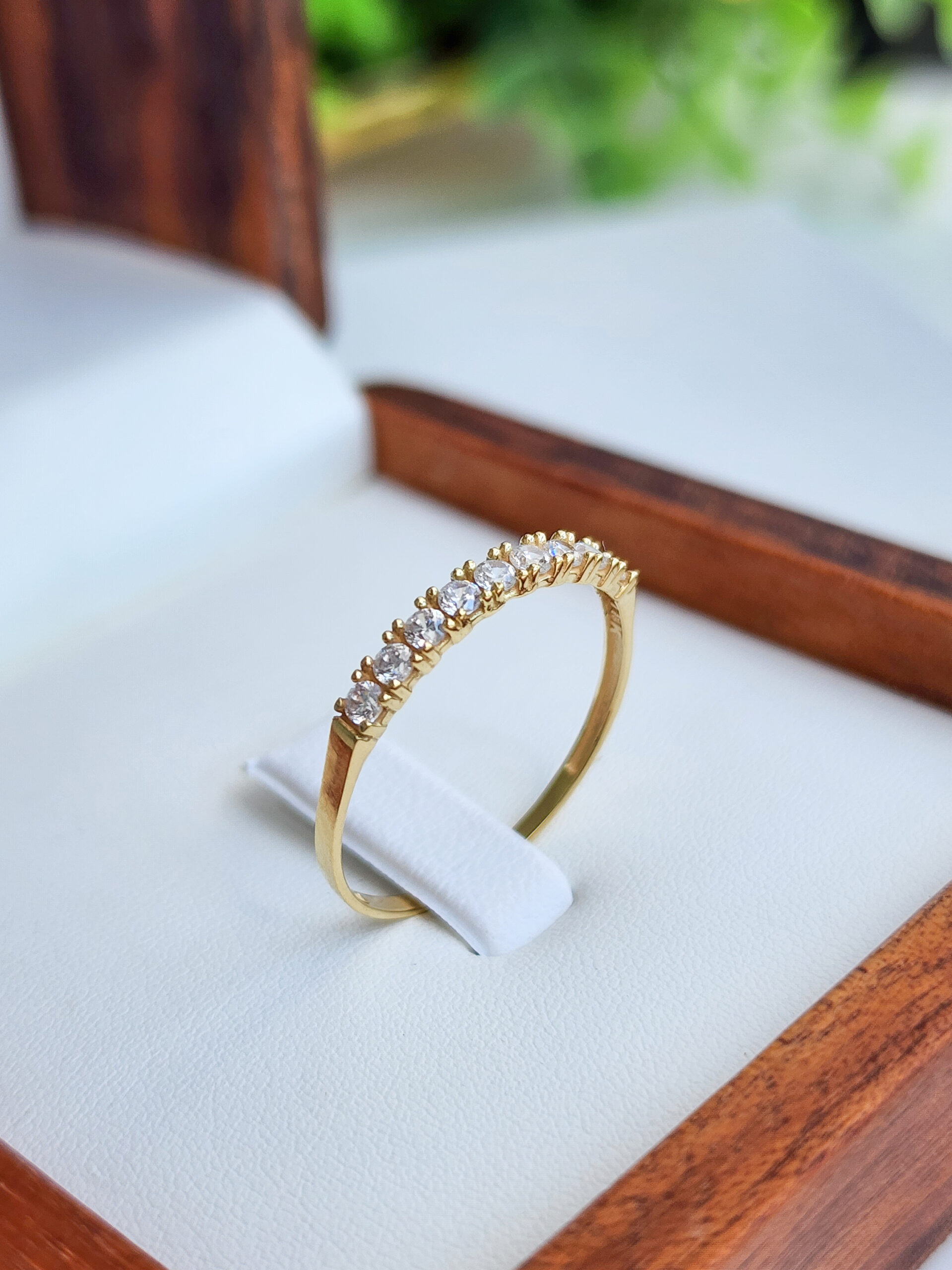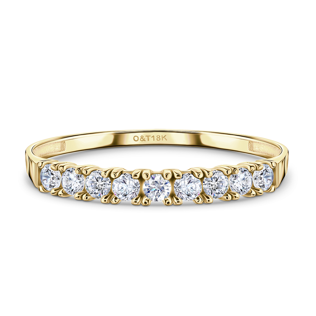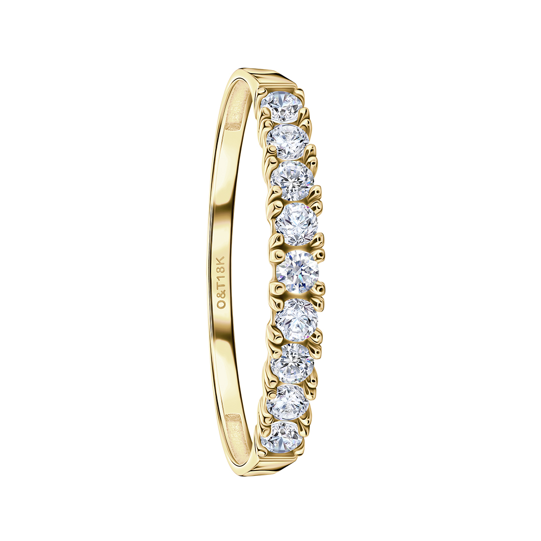 Anel Aparador Em média 1,2g de Ouro 18k; 9 brilhantes de zircônia de 2mm cada.